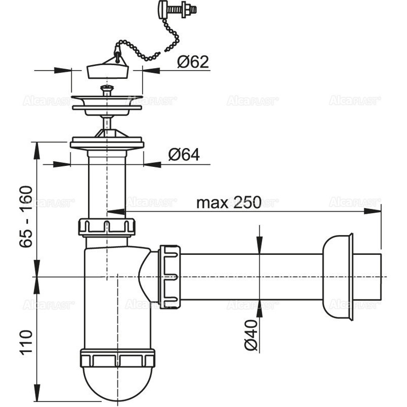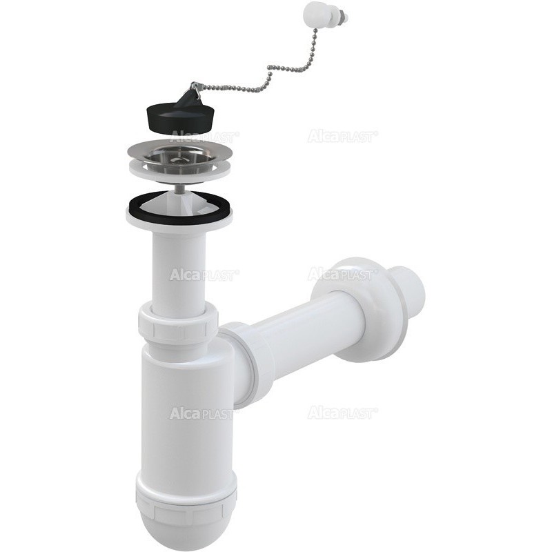 Alcaplast Syfon umywalkowy Ø40 z przyłączem i nierdzewnym sitkiem Ø63, łańcuszek A41R