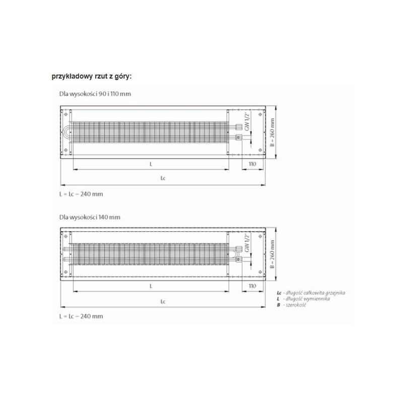 Od góry grzejnik zabezpieczony jest poprzeczną lub podłużną kratką maskującą wykonaną z materiału z oferty producenta, którą należy zamawiać osobno.