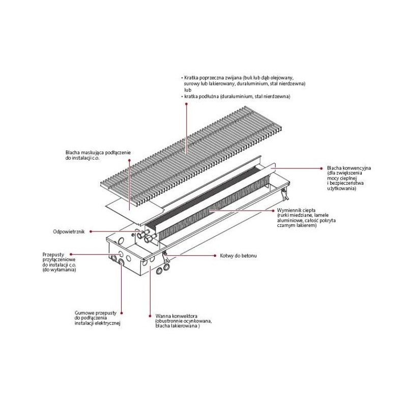 Elementem grzejnym jest miedziano-aluminiowy wymiennik ciepła, pomalowany na kolor czarny, zamontowany w wannie stalowej, obustronnie ocynkowanej, pomalowanej od wewnątrz także na kolor czarny.