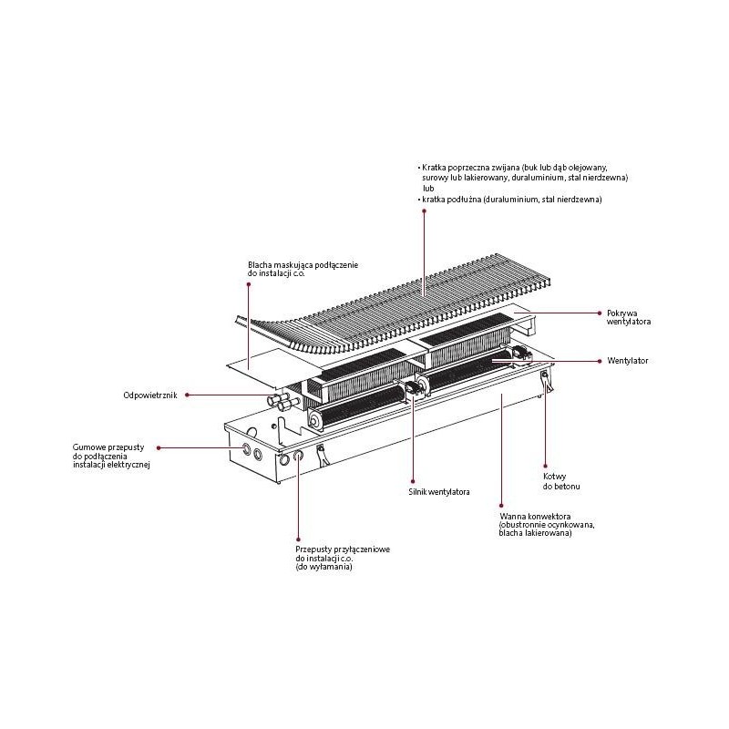 Od góry grzejnik zabezpieczony jest poprzeczną kratką maskującą wykonaną z materiału z oferty producenta, którą należy zamawiać osobno. Podłączenie wymiennika do instalacji grzewczej poprzez dwa króćce z gwintem wewnętrznym G 1".