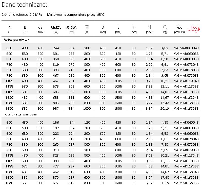 | Inne: | Grzejnik dostępny we wszystkich kolorach RAL oraz kolorach specjalnych TERMA, w tym grube struktury i sanitarne – dopłata 25% do ceny grzejnika w kolorze białym. |