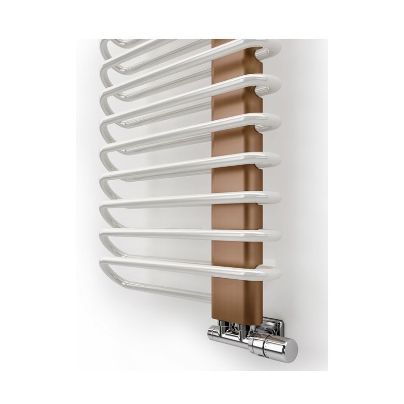 Michelle podłączany jest do instalacji za pomocą przyłącza dolnego o rozstawie 50 mm - co pozwala na zastosowanie ozdobnego bloku zaworowego idealnie pisującego do tego modelu grzejnika.