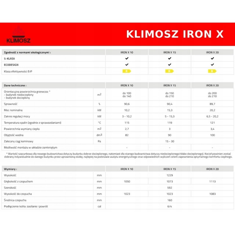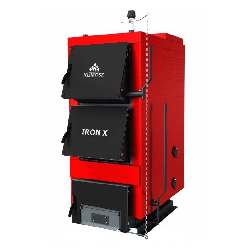 Klimosz IRON X to kocioł o wysokim odzysku ciepła ze spalin co pozwoliło na zmniejszenie zużycia opału nawet do 30 % w stosunku do mniej wydajnych kotłów poprzedniej generacji. Lepszą funkcjonalność kotła zapewnia relatywnie duża komora spalania w połączeniu z ruchomym rusztem. Obsługa kotła jest wygodna i prosta, dzięki ułatwionemu dostępowi do kanałów konwekcyjnych i dużym drzwiczkom załadunkowym. Kocioł wykorzystuje technikę dolnego spalania węgla kamiennego zapewniającą ekonomiczne i czyste spalanie paliwa. W tylnej części komory spalania znajduje się dysza ceramiczna złożona z kształtek ceramicznych.+