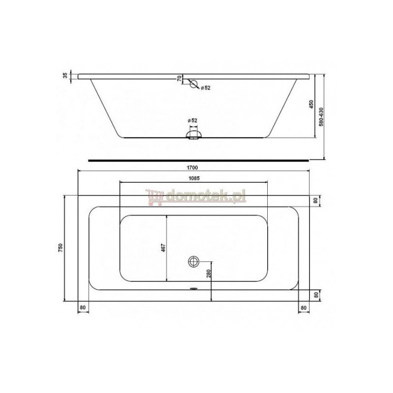 Wanna Koło Modo 75 x 170 cm z odpływem na środku z nogami w komplecie